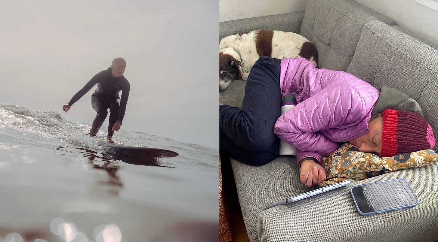 When I paddled out to surf last Wednesday afternoon with Kate and Lan and surged ahead of them to reach the takeoff zone first, I noticed my mind fretting about going back to work.